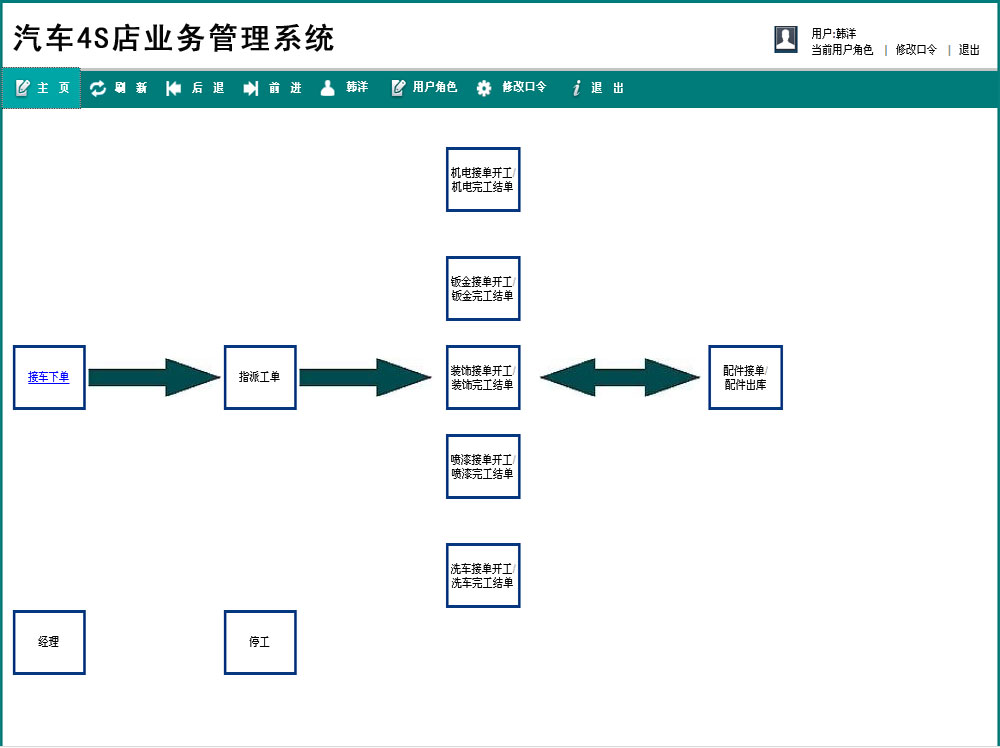 车间工人接单后进行车辆维修,如需配件则进行配件,完工后申请检测,车辆将进入相应工序。