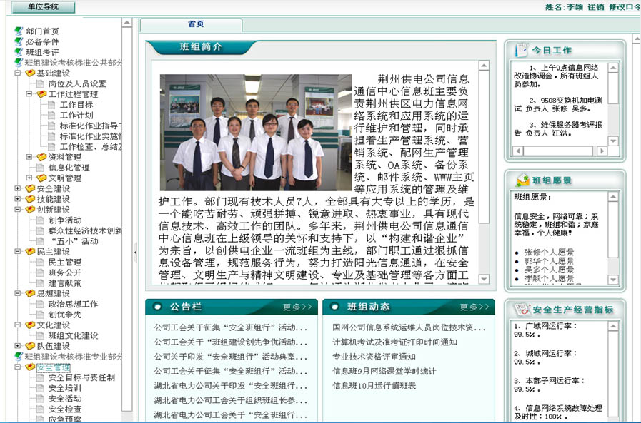 基层班组主页共设置了七个功能模块,依次为班组工作树、班组简介、近期工作、班组愿景、公告栏、班组动态、安全生产经营指标。