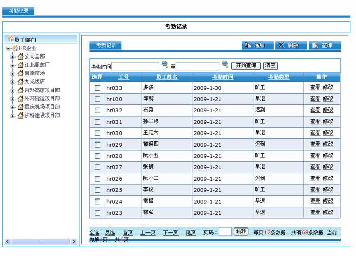 系统支持请假、出差、加班、补休、调班、停工等考勤业务管理。