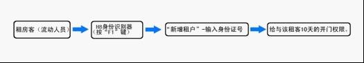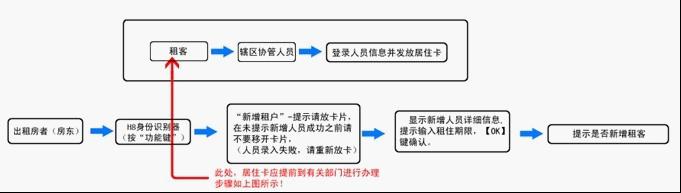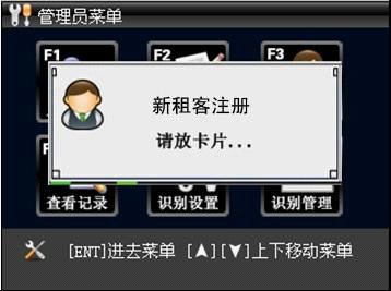 出租房房东身份验证,按 功能键 (可指定)→ 新增租户 →提示请放卡片,在未提示新增人员成功之前请不要移开卡片(人员录入失败,请重新放卡)→