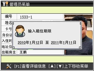 显示新增人员详细信息(可定制显示内容)→提示输入租住期限→OK键确认→输入截止时间→OK键确认→