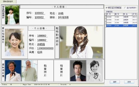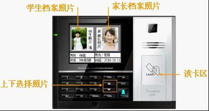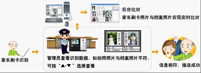 设备安装于门卫室旁,家长进门时,首先进行刷卡,家长刷卡以后,管理员现场查看刷卡信息,比对照片,如与档案照片不符(因小孩可能对应多位家长接送),则按“↑”与“↓”键,查看所属其他家长照片,查到该家长照片则完成接送。后台管理员可实时查看刷卡数据,实现实时查看。