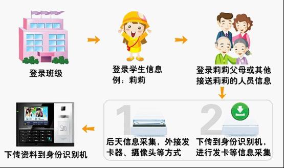 新生入学,学生与家长到校务办进行信息采集。以本机采集为例,家长信息录入以后传输到识别机,然后在识别机上进行发卡及照片采集,采集完成后,软件进行信息汇总,卡号及照片存入数据库。后期可增加家长信息数量,最大数量为10个。