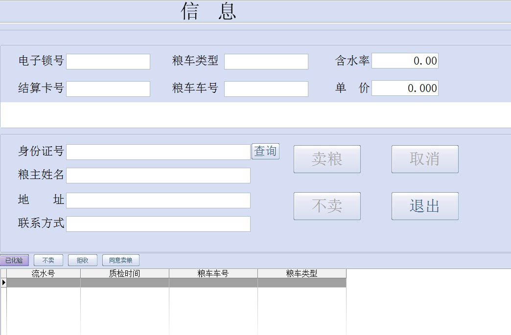 E. 信息处根据质检结果反馈给客户(拒收或者粮价)粮价根据系统设定的含水值自动计算