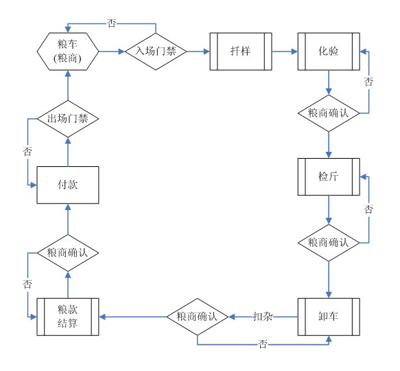 D. 质检处化验并得出粮的参数,含水,如果不合格则拒收