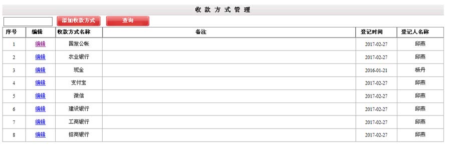 收款方式名称、备注、登记时间、 登记人名称。