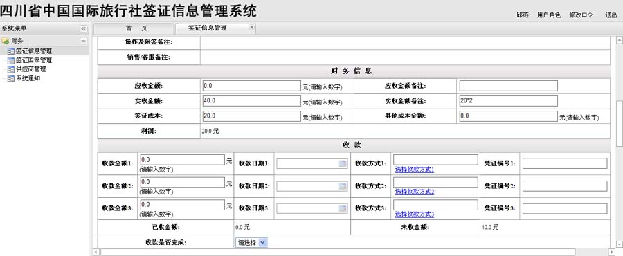 应收金额、应收金额备注、实收金额、实收金额备注、签证成本、其他成本金额。