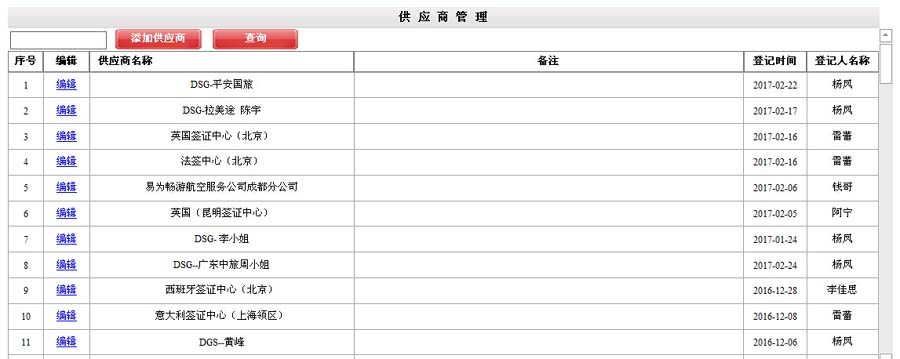供应商名称、备注、登记时间、 登记人名称 。