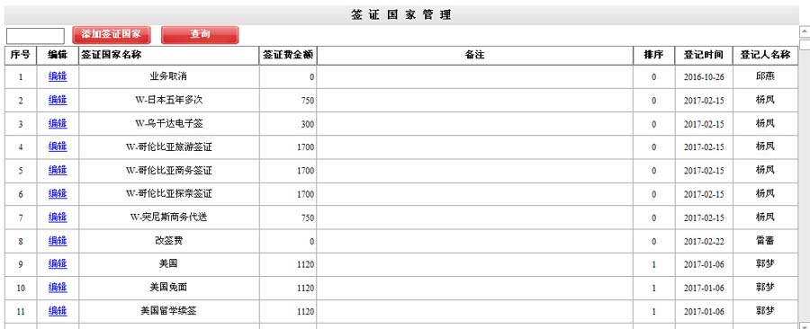 签证国家及类型管理: