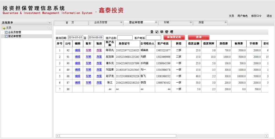 登记单信息包括客户名称、身份证号、公司经办人、客户电话、拆借、借款金额、借款利率、查档费、他项费、手续费、首付利息、首次放款金额、业务员、接件人审核、经理审核、出资人、出资人利率、添加日期、备注等。