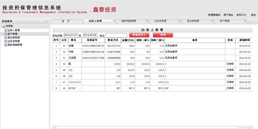 出资人信息包括姓名、身份证号、联系方式、出资金额、利率一拆、利率二拆、备注、状态、添加时间等。