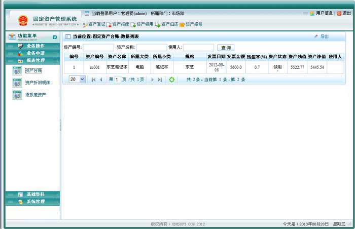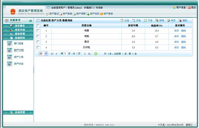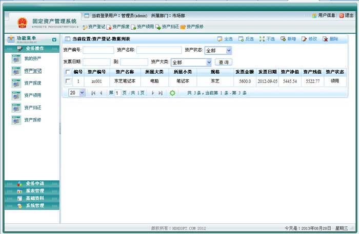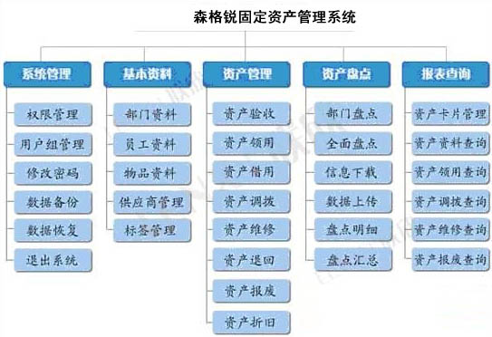 入库管理,出库管理,借用管理,调拨管理,报废管理,移动管理,车辆管理(车辆的行驶记录管理和车辆信息管理),台账查看(除了可以看资产的基本信息还可以及时查看资产的累计折旧和净残值),盘点报表,扫码,标签打印,系统管理,办公用品进销存模块。