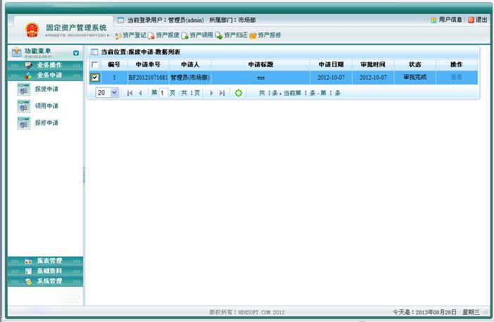 系统运用先进的条码技术来进行企业资产管理,包括多单位资产的帐套管理、资产新增、修改、拆分、复制、转移、退出、撤消退出、主附资产转换,资产在用情况、是否到期、是否完好以及记录资产其他动态情况的历史资产信息等,实现了“卡、帐、物”三者相符,轻松实现企业资产的全程监控,为企业高效的资产管理提供强有力的保障。